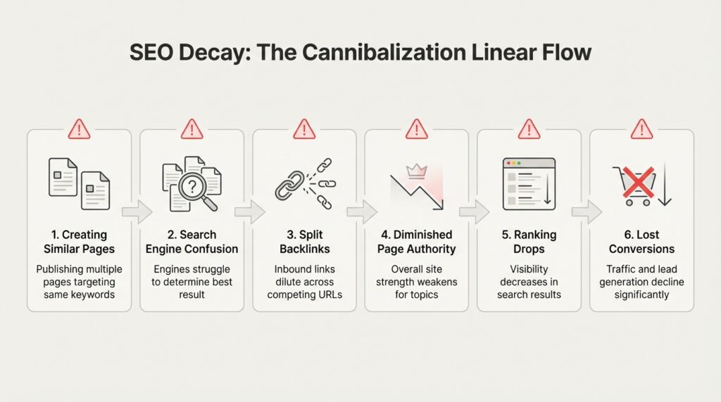 When your pages compete with each other, the damage isn’t just theoretical. Here’s what actually happens: