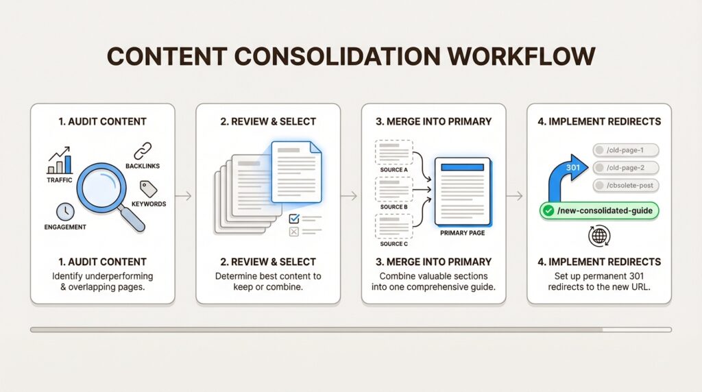 This is often the most effective solution. Identify your strongest page (the one with the most traffic, backlinks, and best rankings), then merge valuable content from the weaker pages into it.