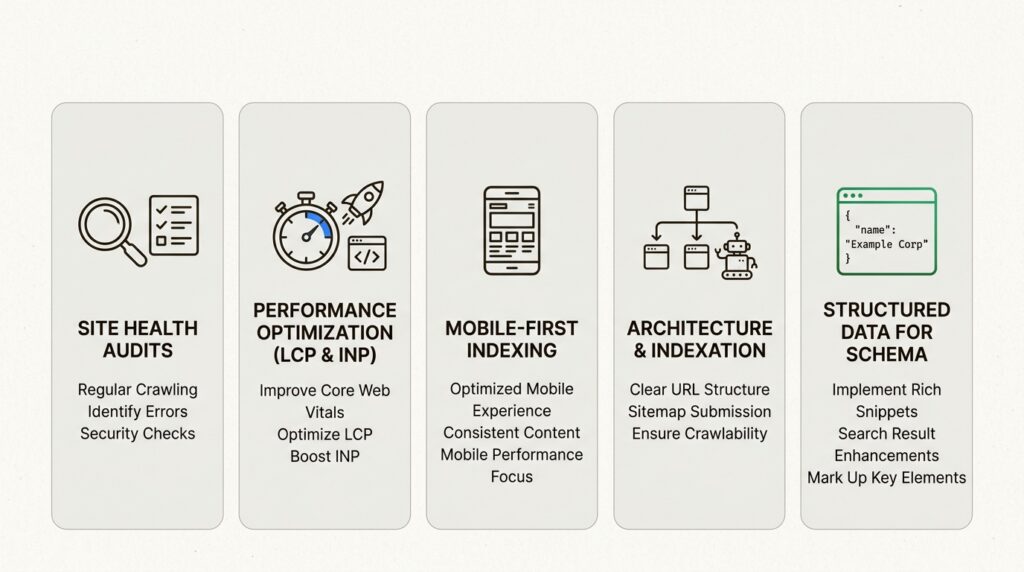 For small businesses, prioritize: (1) technical audits to identify critical issues, (2) Core Web Vitals optimization for site speed, (3) mobile optimization for mobile-first indexing, and (4) local SEO technical setup including schema markup for local business. These deliver the highest ROI for limited budgets before expanding into more advanced optimizations.
