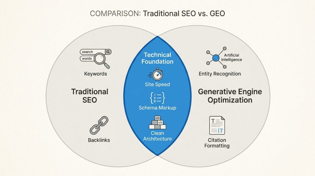 The technical foundation that helps traditional SEO (fast loading, clean architecture, structured data) helps even more with AI search. But GEO adds new dimensions: