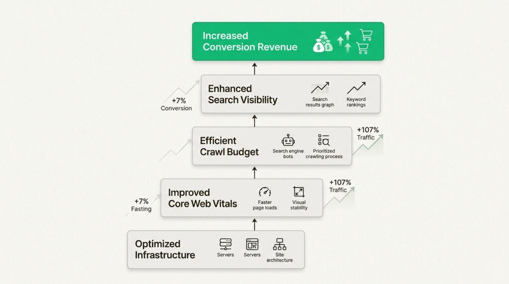 - Month 2-3: Core Web Vitals improvements visible, indexation issues resolved