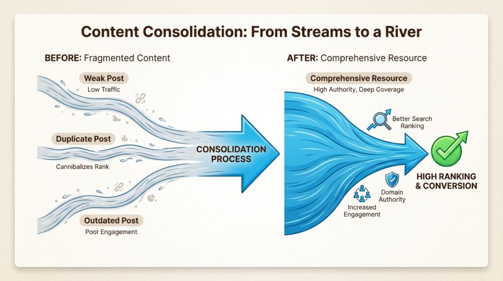 Sometimes the best solution is to merge multiple similar pages into one comprehensive resource. This is particularly effective for: