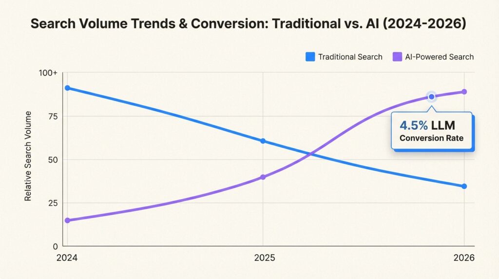 But here is what makes this different from every other “SEO is dead” prediction you have heard: the traffic that is moving to AI search often converts better. Research from Knotch shows LLM conversion rates more than doubled from September 2024 to June 2025, while organic search conversions declined by 38%. Some businesses report LLM traffic converting above 4.5%, with 20-25% monthly growth in AI-referred visits.