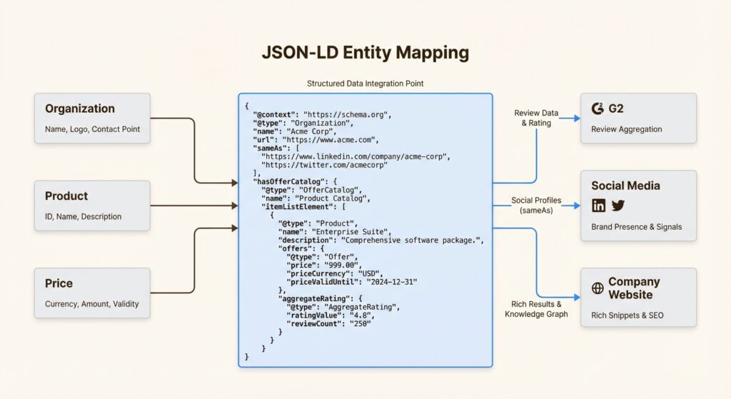 Use JSON-LD structured data to define entities clearly. Schema markup helps LLMs understand that “Acme Corp” is the organization, “Pro Suite” is the product, and “$99/month” is the pricing. This structured approach reduces ambiguity.