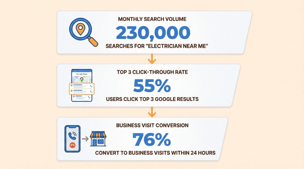 Here’s what that means for your bottom line: 76% of people who search for a local service visit a business within 24 hours. When someone’s power goes out or they need an emergency repair, they’re not browsing. They’re ready to hire. If your business appears at the top of the search results, you get the call. If you don’t, your competitor does.
