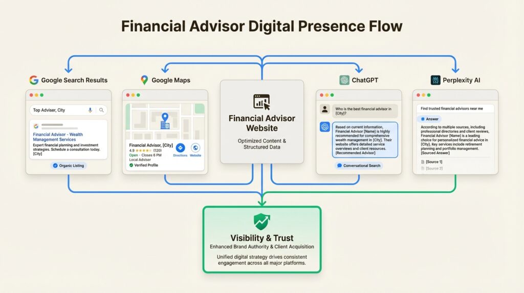 But here’s what’s changing: traditional Google SEO isn’t enough anymore. In 2026, your prospects aren’t just searching Google. They’re asking ChatGPT for advisor recommendations. They’re using Perplexity to research fee structures. They’re seeing Google AI Overviews before they ever click a website link.
