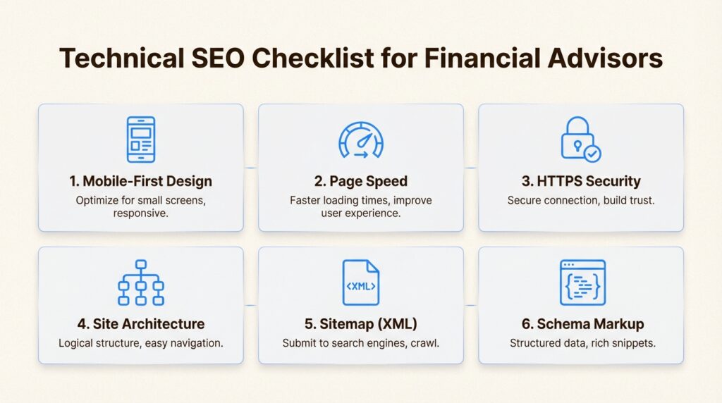 Site speed affects both rankings and conversions. A one-second delay in page load time can reduce conversions by 7%. For financial advisors, where trust is paramount, a slow site suggests technical incompetence.