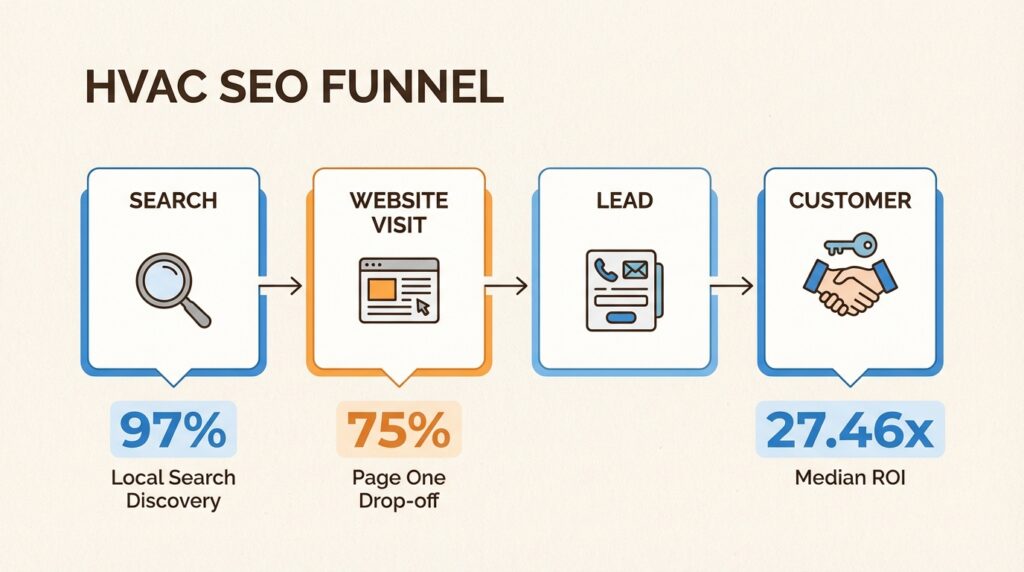 This is the reality of running an HVAC business in 2026. 97% of people learn about local companies online more than anywhere else, and 75% never click “next” to see the second page of search results. If your HVAC company isn’t showing up when potential customers search, you’re handing those jobs directly to your competitors.