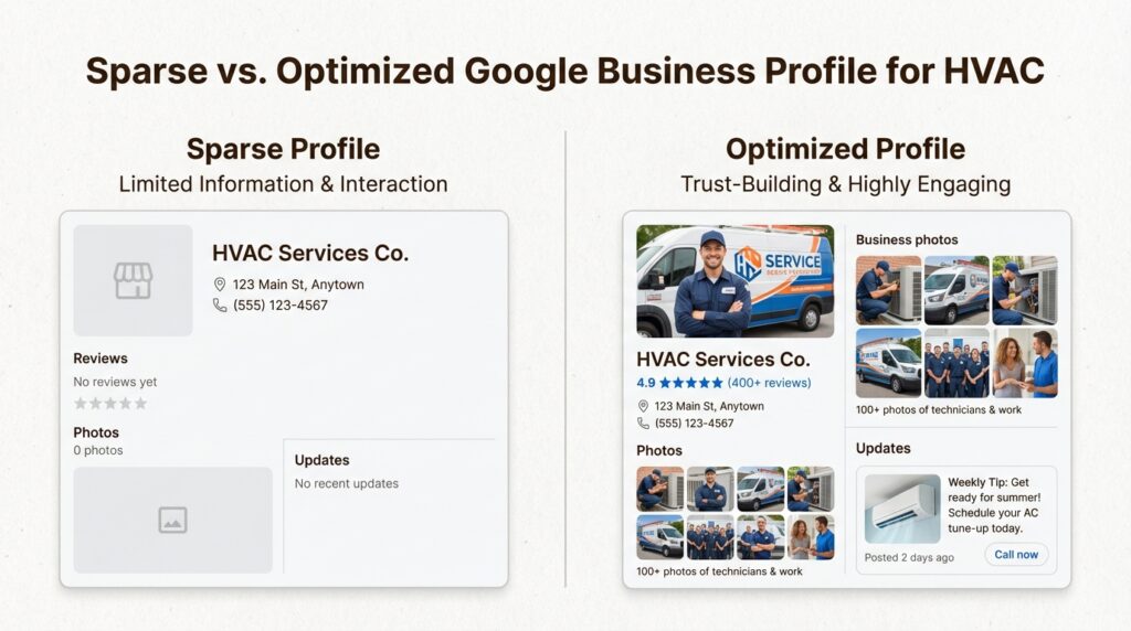 Choose the right categories. Your primary category should be “HVAC Contractor.” Add secondary categories like “Air Conditioning Repair Service,” “Heating Contractor,” and “Furnace Repair Service.” Each relevant category expands the queries that trigger your profile.
