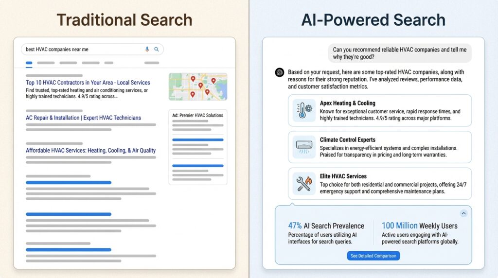 - New way: Customer asks ChatGPT “who’s the best HVAC company in my area?” → AI recommends 2-3 businesses → customer calls the top recommendation