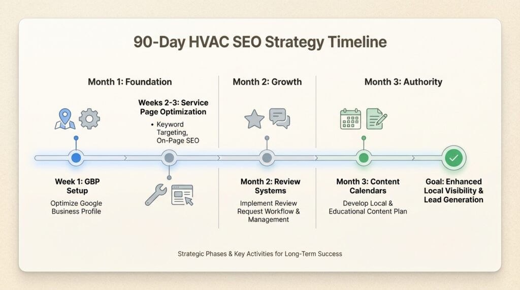 Most HVAC companies see initial ranking improvements in 90-120 days, with significant lead generation improvements in 3-6 months. Dominant market positioning typically takes 6-12 months of consistent optimization.