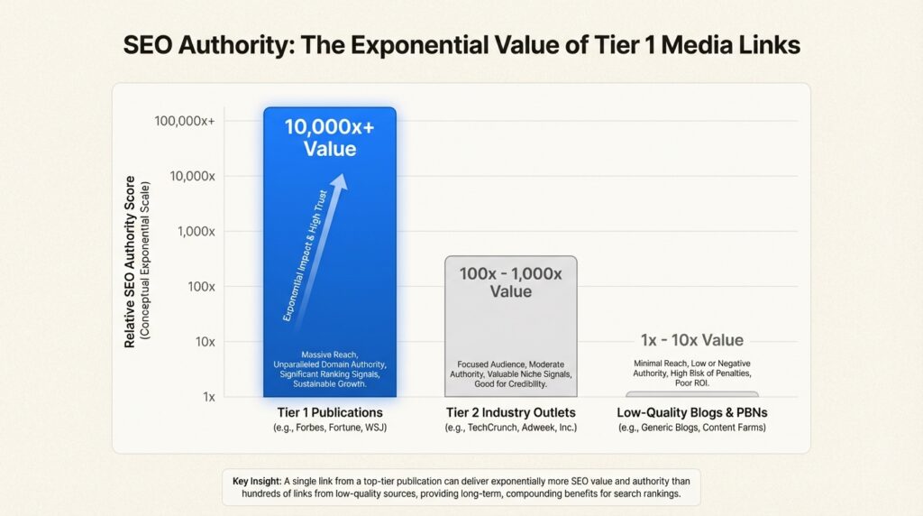 The tier system matters here. Tier 1 publications (Forbes, Fortune, FastCompany, major national outlets) deliver maximum authority. Tier 2 publications (industry-specific outlets like PrintWeek for printing companies or TechCrunch for startups) provide targeted relevance. A common misconception is that quantity beats quality. It doesn’t. Ten links from tier 1 and tier 2 publications will outperform hundreds of low-quality links.