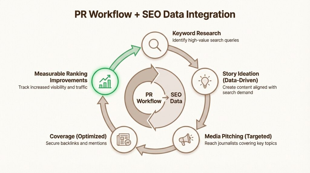 The integration works both ways. PR teams can use keyword research to validate story angles, while SEO teams can use PR placements to build authority for priority keywords.