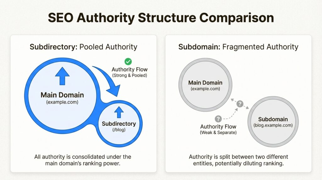 Domain authority fragmentation. When you create a subdomain, it doesn’t inherit your main domain’s authority. If yoursite.com has a Domain Authority of 60, blog.yoursite.com starts from scratch. It needs to build its own backlink profile, earn its own trust signals, and climb the rankings independently. According to Moz’s research on domain authority, subdomains typically start with their own DA score separate from the main domain.