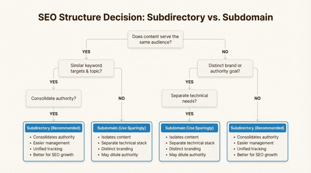 If you answered yes to most of these, use a subdirectory. If the content is truly separate (different audience, different purpose, different business line), a subdomain might be the right call.