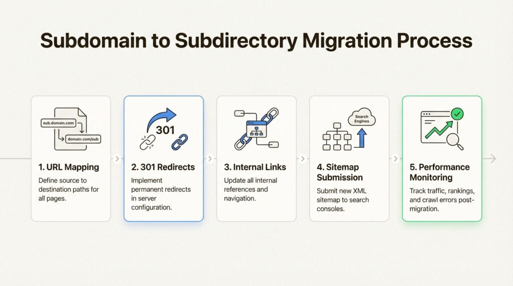 2. Set up 301 redirects. Redirect every subdomain URL to its new subdirectory location. This passes most of the link equity to the new URLs.