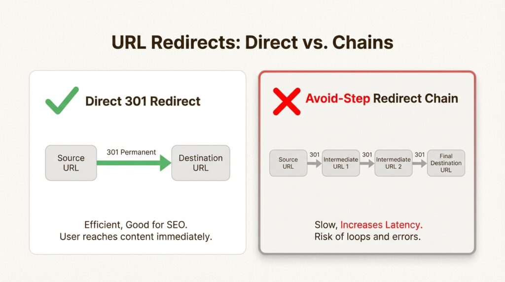 - Avoid redirect chains: old → new, not old → intermediate → new