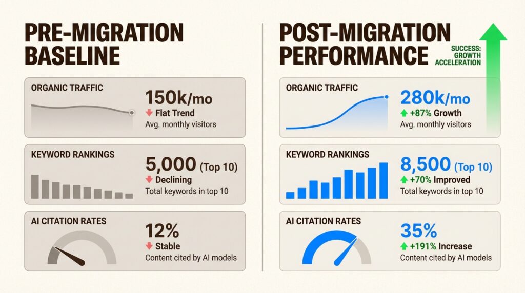 This is why we recommend tracking your AI visibility metrics before, during, and after any migration. The signals that matter for AI engines are subtly different from traditional ranking factors.