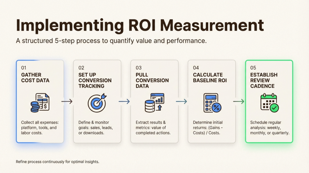 Add these up for your chosen time period (typically quarterly or annually). Be thorough. Underestimating costs inflates your ROI artificially.