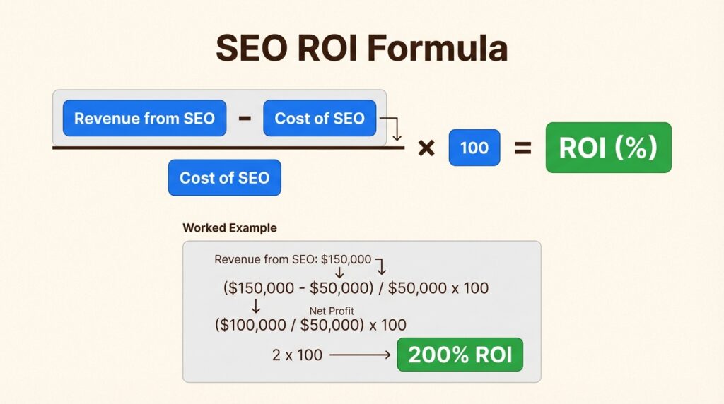 The formula scales to any business size. A local contractor spending $2,000/month on SEO and generating $8,000/month in leads calculates the same way: ($8,000 – $2,000) / $2,000 × 100 = 300% ROI.