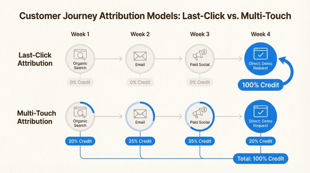 The customer journey rarely follows a straight line. A prospect might discover you through organic search, follow your newsletter for months, then convert after clicking a retargeting ad. Last-click attribution gives all credit to the ad. That’s not the full story.
