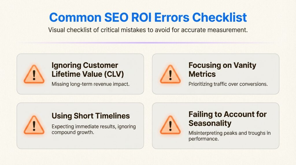 Using vanity metrics as ROI proxies. Rankings and traffic are diagnostic metrics, not business outcomes. You can rank #1 for high-volume keywords that never convert. Track revenue, not just visibility.